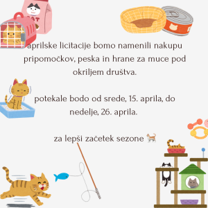 Marčevske licitacije so tukaj. 🌷🌸 Kot smo že zapisali v najavi – tokrat licitacije namenjamo pokritju stroškov, ki so nastali ob ureditvi več mačk v